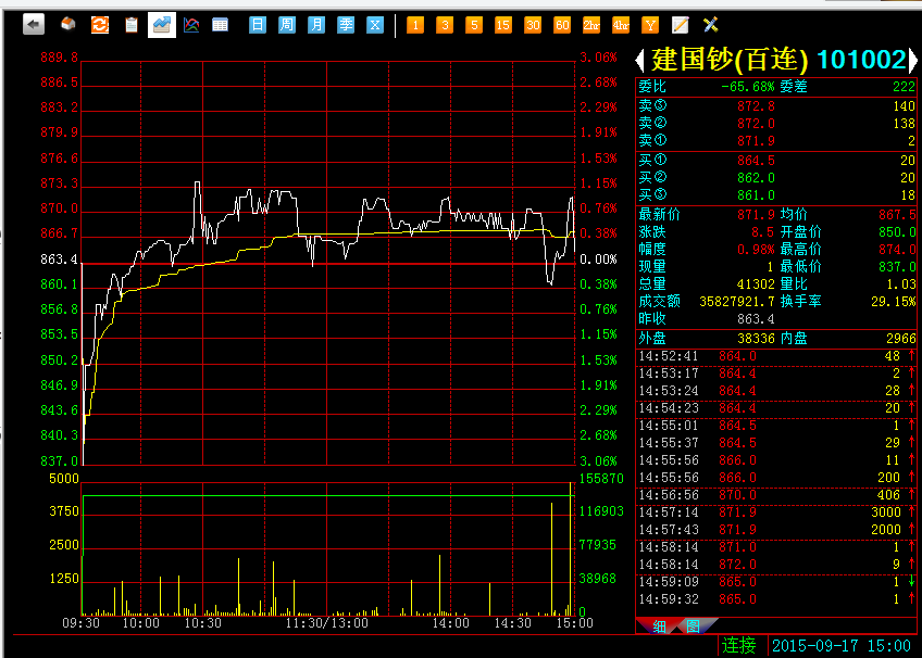 101002建国钞(百连),2015年9月17日成交量41302,成交额3583万。