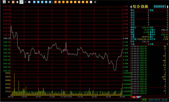 大盘综合指数收于1262.40,跌5.89点,跌幅0.46%,成交额3.38亿元。早盘大盘延续昨日反弹走势继续上行,但遗憾的是市场做多意愿并不浓厚,大盘冲高不到0.50%即承压回落,之后就是一路震荡下行直到收盘,整体表现非常弱势,想要继续反弹的走势戛然而止,至此,大盘再次有了往下探底的趋势,短期后市行情不容乐观。