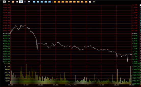 南方所综合指数技术形态分析:综合指数技术形态上形成了受挫的形态,盘中市场强力下挫并且连续创出新低,最低点一度到达1273.58点,全天一路下探,价格始终低位震荡全天无任何反弹迹象,收盘后日线呈现一个大阴线。