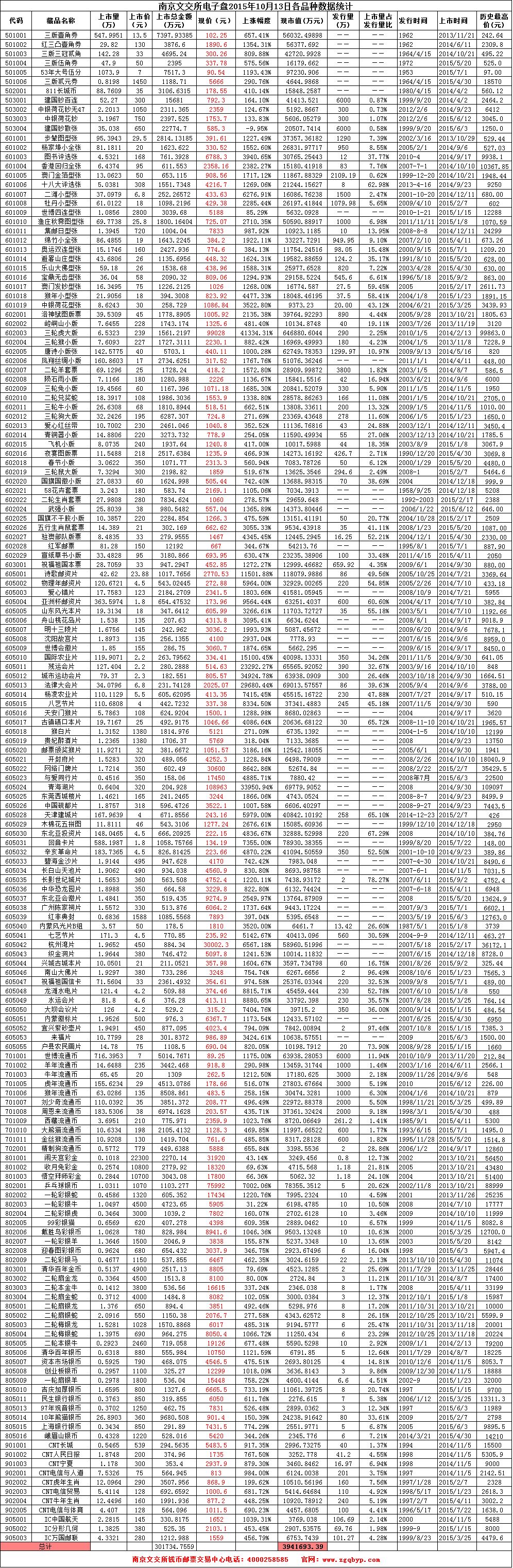 南京文交所电子盘2015年10月13日各品种数据统计