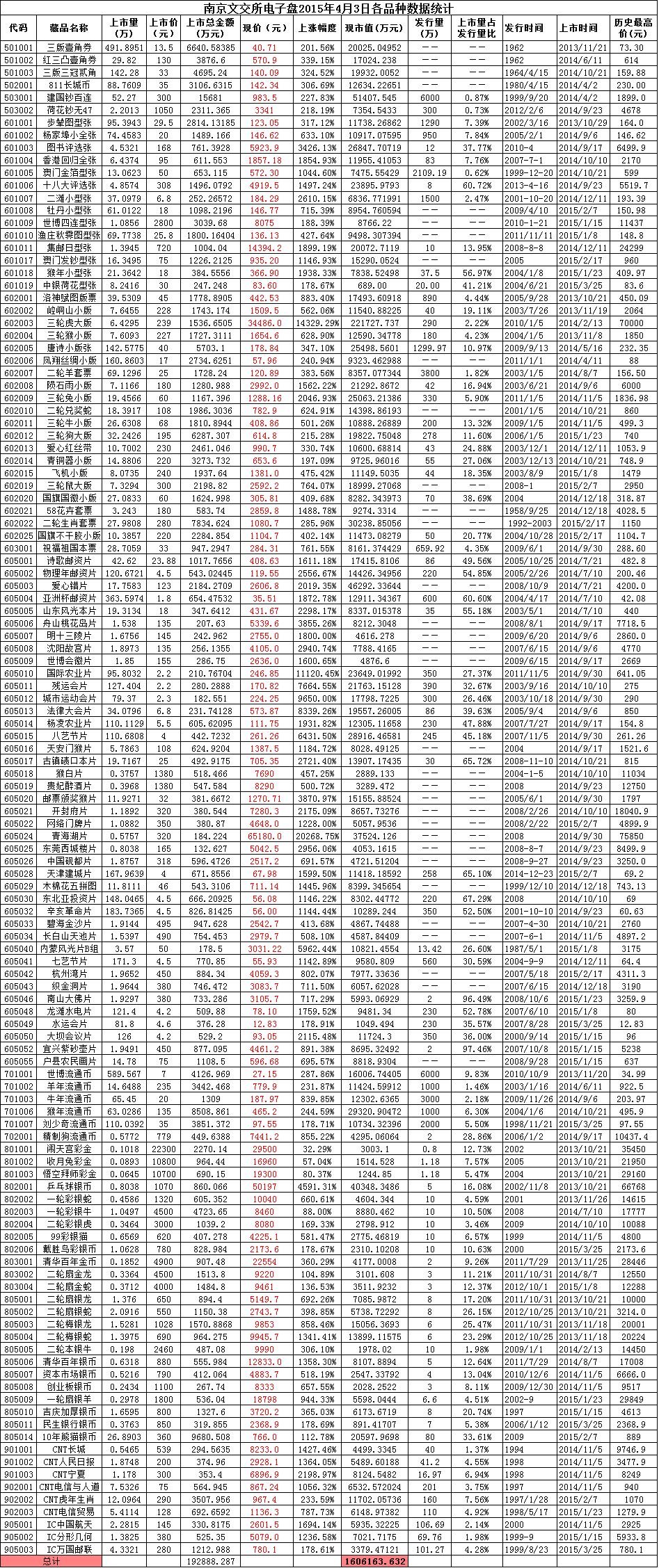 南京文交所电子盘2015年4月3日各品种数据统计