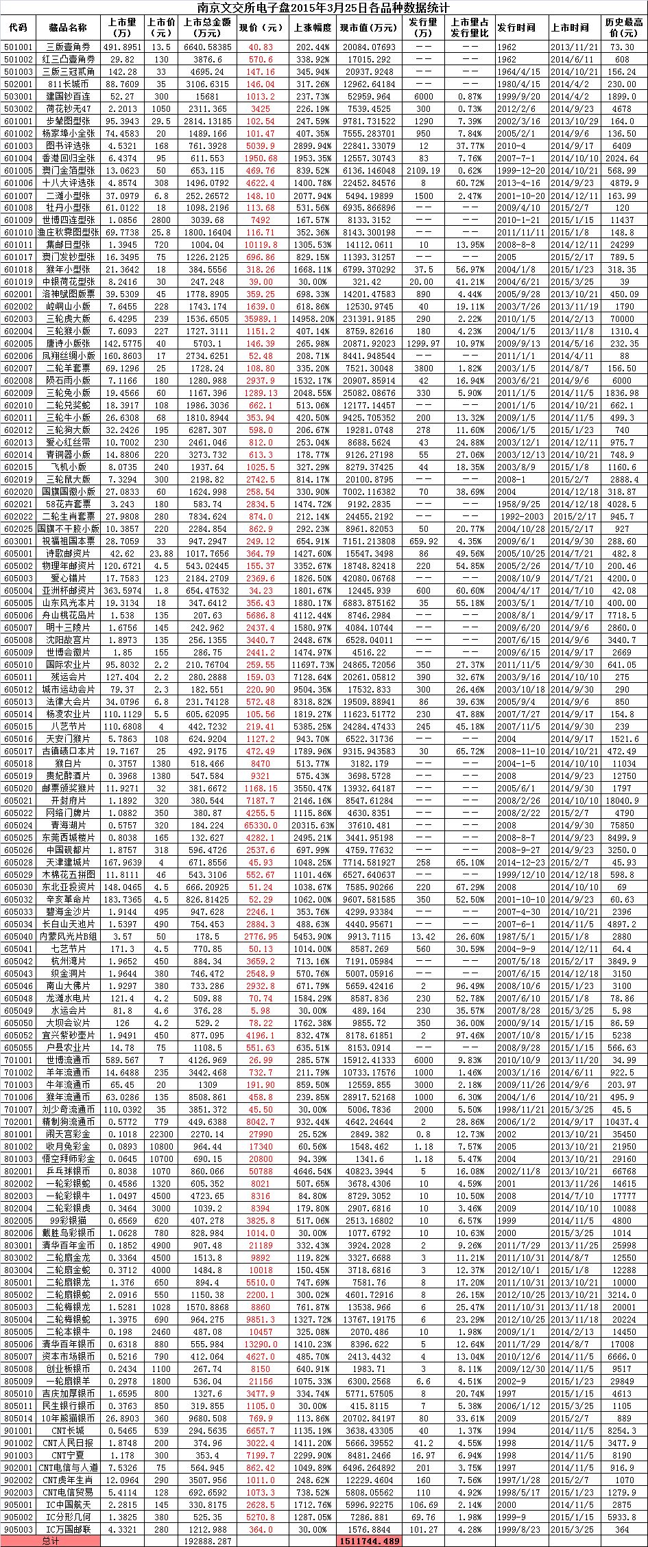 南京文交所电子盘2015年3月25日各品种数据统计