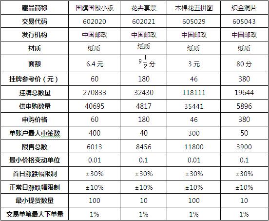 经南京文化艺术产权交易所钱币邮票交易中心(以下称本中心)普通投资人会员申请,综合经纪会员推荐,本中心专家委员会、新藏品挂牌审核小组评估审核通过,鉴定机构鉴定合格入库完毕,《国旗国徽小版》、《花卉套票》、《木棉花五拼图》、《织金洞片》准予在本中心钱币邮票线上实物交易系统正式挂牌交易,具体事项公告如下: