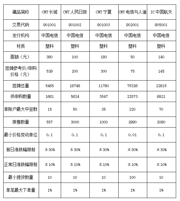 经南京文化艺术产权交易所钱币邮票交易中心(以下称本中心)普通投资人会员申请,综合经纪会员推荐,本中心专家委员会、新藏品挂牌审核小组评估审核通过,鉴定机构鉴定合格入库完毕,《CNT长城》、《CNT人民日报》、《CNT宁夏》、《CNT电信与人道》、《IC中国航天》等藏品准予在本中心钱币邮票线上实物交易系统正式挂牌交易,具体事项公告如下: