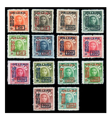 (1)—(4)于1950年6月9日发行,(5)—(14)于1950年7月6日发行。原票为雕刻版,齿孔14度,无背胶,邮局全张枚数200(20×10)。加盖邮局全张枚数50(10×5)。北京人民印刷厂机盖。原票:中央版限东北贴用孙中山像,雕刻版,19.5×21.5mm,200(20×10),P14,无背胶。