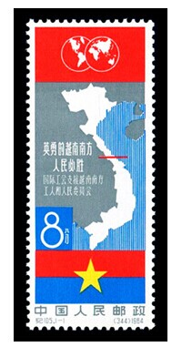 这套邮票的发行,充分表达了中国人民对越南人民抗美爱国斗争和统一祖国愿望的支持。图案由国际工会支援越南南方工人和人民委员会提供。其主图为狭长的越南地图,中间被一条红线(北纬17度线)分割。主图上方为东、西两半球的平面图,越南是全球的一部分。而下方为越南南方民族解放阵线的旗帜,由红蓝两部分和一颗黄五角星组成,象征着各阶层人民紧密团结,共同战斗,为解放南方和统一祖国而奋斗。画面简洁,赋色鲜明,寓意深刻,实为1枚佳作。同日,越南为纪念《日内瓦协议签订十周年》也发行了一套2枚邮票,其中1枚与我国发行的这枚邮票图案相似,表现了两国的共同理想和愿望。