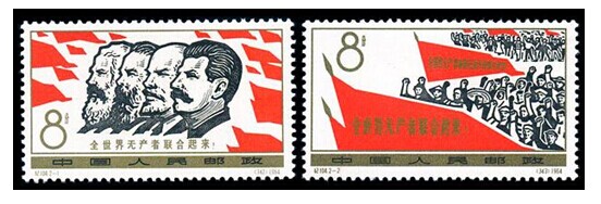 值此“五·一”国际劳动节之际,邮电部发行了这套以此口号为题的纪念邮票,再次强调了它的世界意义。2幅画面,均以其层次清晰的构图为特色。第1图为马、恩、列、斯像,以四位伟人像为主图,展示了科学共产主义理论创始人及实践者的伟大。第2图为全世界无产者联合起来,画面以“全世界无产者联合起来”这两句战斗口号为旗帜,展示了无产阶级世界革命洪流的汹涌澎湃。