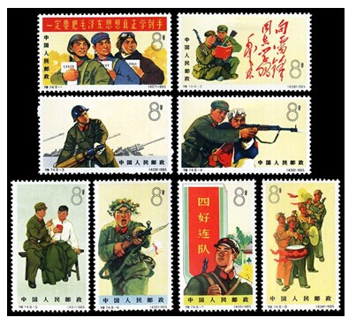 就是在这种政治和社会背景下,在中国人民解放军建军38周年之际,邮电部发行了这套特种邮票,8幅画面均采用了当年的宣传画进行设计,反映了部队的一些生活。在邮票发行前夕,《集邮》杂志请当时任国务院副总理兼国防部长的林彪为这套邮票题词。7月26日,林彪为这套邮票写下了“中国人民解放军是毛泽东思想武装起来的队伍,是全心全意为人民服务的队伍,因而是战无不胜的队伍”,发表在8月号的《集邮》杂志上。