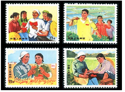 1969年10月1日,正值国庆节,为了宣传知识青年在农村锻炼成长的情况,中华人民共和国邮电部发行一套《知识青年在农村》“文”字头邮票,全套4枚。其中(1)(2)李大玮设计,(3)(4)张克让设计。影写版。齿孔11度×11.5度。背面刷胶。邮局全张枚数50(5×10)。北京邮票厂印制。