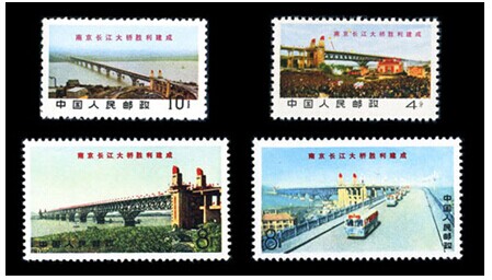 1969年5月1日国际劳动节,为了庆祝南京长江大桥胜利建成,中华人民共和国邮电部发行一套《南京长江大桥胜利建成》“文”字头邮票,全套4枚。其中(3)于1969年6月18日发行,(4)于1969年8月26日发行。夏中东设计。其中(1)、(2)影写版,(3)、(4)胶版。齿孔(1)、(2)11.5度,(3)11度×11.5度,(4)11.5×11度。背面刷胶。邮局全张枚数(1)、(2)为50(5×10),(3)、(4)为100(10×10)。北京邮票厂印制。