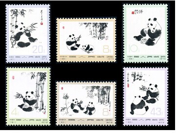 熊猫是中国特产的稀有动物,是吉祥友谊的象征,是和平友好的使者。为进一步宣传我国这一特有珍稀动物,增进与各国的交往和友好,1973年1月15日,中华人民共和国交通部发行一套“熊猫”编号邮票,全套6枚。这是继1963年8月5日,邮电部发行的特59《熊猫》邮票之后,我国正式成套发行的第二套熊猫邮票,两套邮票的图案均依据我国著名画家吴作人先生所创作的原画进行设计,生动而逼真地表现出这一稀珍动物的生活习性和特征。这套邮票分别以不同的浅淡单色为边框,形成多色套边,犹如一幅幅采用绢绫装裱的水墨画,精巧典雅。图案全部采用画家吴作人1972年绘画的水墨熊猫图,原画上的题字和印章完全保留,这在新中国邮票设计史上是第一次。