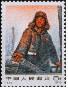 1972年12月25日,为了纪念中国石油产品基本自给10周年,中华人民共和国交通部发行一套《中国工人阶级的先锋战士——铁人王进喜》编号邮票,全套1枚。孙鸿年设计、雕刻。影雕套印。齿孔11度×11.5度。背面刷胶。邮局全张枚数50(10×5)。北京邮票厂印制。