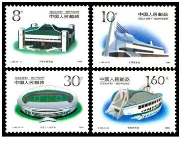 1989年12月15发行的“1990北京第十一届亚洲运动会(第二组)”纪念邮票,编号J165,全套4枚,介绍了4个亚运会比赛场馆。