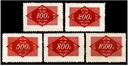 全套5种,画面均呈红色,主图相同,票幅为横长方形,内置菱形框,欠资面值居中,字体较大,突出醒目;“欠资”和“中国人民邮政”分列面值上下。这套票使用到1955年12月,从发行到停用仅一年多。1955年3月,币制变更,它便逐渐进入集邮领域,新票相对较多。