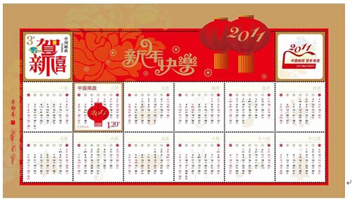 另:采用“贺新春”(邮票面值1.20元,邮票规格36×36毫米)和“贺新禧”邮票印制小全张1枚(整张规格:240×135毫米),专用于2011年中国邮政贺卡幸运封。