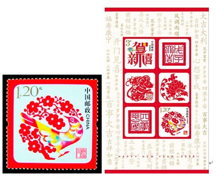 注:采用“喜临门”和“贺新禧”邮票印制小全张1枚(整张规格:110×176毫米),专用于2008年中国邮政贺年(有奖)明信片的幸运封。