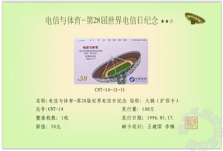 《CNT电信与体育》由权威部门中国电信发行,属于国家有价证券范畴,发行使用规范统一,是我国第一代无人值守公用电话的自费凭证,记录了中国电信在改革开放中发展壮大的步伐,是有面值的正规发行品,和钱币、邮票具有共同属性;电信日题材及体育题材的特殊意义和重大意义;存世量少,发行在1996年,消耗巨大,而且在磁卡和IC卡换卡时,大量换掉销毁,新卡存世量少,预计不超过5万枚,具有收藏品的属性。