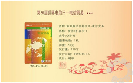《CNT电信贸易》由权威部门中国电信发行,属于国家有价证券范畴,发行使用规范统一,是我国第一代无人值守公用电话的自费凭证,记录了中国电信在改革开放中发展壮大的步伐,是有面值的正规发行品,和钱币、邮票具有共同属性;电信日题材及贸易题材的特殊意义和重大意义;存世量少,发行在1998年,消耗巨大,而且在磁卡和IC卡换卡时,大量换掉销毁,新卡存世量少,预计不超过10万枚,具有收藏品的属性。