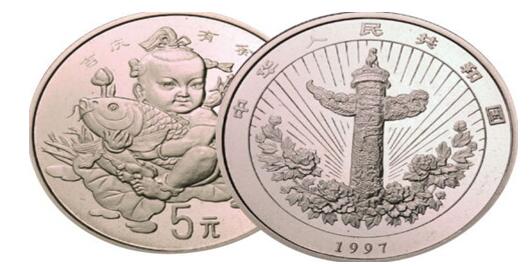 为弘扬中国传统文化,中国人民银行1997年发行了中国传统吉祥图——《吉庆有余》金银币。该套金银币分别由沈阳造币厂、中国金币总公司铸造,中国金币总公司总经销。这套金银币的图案取材于中国民间传统吉祥图案——《吉庆有余》,画面上一个喜气洋洋的童子怀抱一条大鱼,坐在莲叶上,旁边盛开的莲花环绕。鱼者,“余”也,“莲”者,连也。童子抱鱼,即为“吉庆有余”之意,再配上莲花,表示连年有余。吉庆有余是中国民间传统的吉祥图,是勤劳淳朴的人们在新年来临之际对下一年的良好祝愿,表现了人民对富足美好生活的向往。吉庆有余金银币共有10个品种,其中1/2盎司、1盎司普制银币各1种,1盎司、2盎司加厚普制银币各1种,5盎司精制银币1种,1/10盎司、1/20盎司普制金币各1种,1盎司、1/2盎司精制彩色银币各1种,1/10盎司精制彩色金币1种。