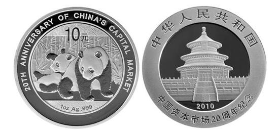中国资本市场20周年熊猫加字银币于2010年12月6日公告发行,它的发行价为435元,在收藏品市场上的价格最高曾上摸1200多元;至2014年9月时止,其市价依然保持在1000附近。其收益率在约3年半时间内高达130%,后市回其知名度和美誉度的持续上升,其投资价值还将突显。