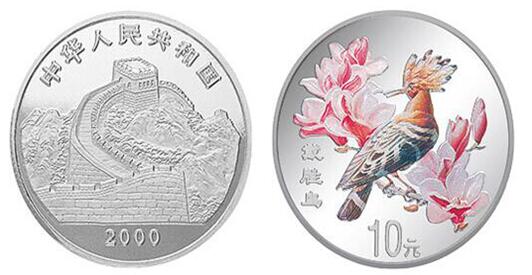 《戴胜鸟》彩色一盎司银币又称作《中国珍禽》彩色银币。它是中国金币总公司最新发行的一枚单枚套彩色银币。于2000年新春佳节期间推出的,寓意 “千年伊始,戴胜如意”的一个非常吉祥、寓意深刻的彩色纪念银币。尤其值得一提的是,以局部彩色的形式在该《戴胜鸟》彩银币上反映的玉兰花也是上海市的市花,它也是上海市的标志性徽记(市花)首次进入国家发行的金银纪念币领域。