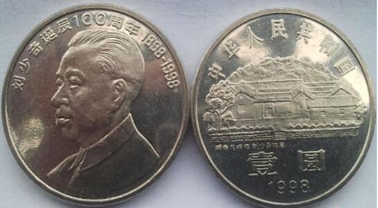 为缅怀革命先烈的丰功伟绩,加强爱国主义教育,中国人民银行于1998年11月21日发行了一套名为《刘少奇诞辰100周年》的流通纪念币。《刘少奇诞辰100周年》流通纪念币全套共计1枚,面值1元,重量6.05克,直径25毫米,厚度1.85毫米,材质为钢芯镀镍,质量普制。《刘少奇诞辰100周年》流通纪念币由上海造币厂铸造,发行量2000万枚。经中国人民银行授权,北京康银阁钱币有限责任公司还同时发行了编号为98-6-1-1,总装帧量为75万的同名“装帧卡”。《刘少奇诞辰100周年》流通纪念币的正面图案为湖南花明楼刘少奇故居,内缘上方铸有“中华人民共和国”的中文字样,下方铸有“湖南花明楼刘少奇故居”的中文字样和外景,同时还铸有“壹圆”和“1998”的年号等字样。背面图案选自《刘少奇选集》的刘少奇头像、内缘上方为“刘少奇诞辰100周年”字样,以及“1898-1998”的年号。