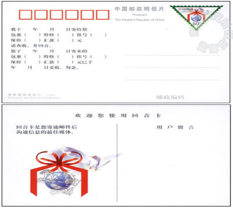 回音卡的品种可分为两大类:一是国家邮政局发行的;二是从1995年起由地方印制的。地方印又分邮资片加印和专门印制两种。邮政局规定:“非国家邮政局印制发行的回音卡,自2000年7月1日起停止销售。”回音卡上有关项目也分两种:一种是单向性的,只有收件人填写的项目;另一种是双向性的,寄件人或收件人都可选用,这种办法符合普遍服务的宗旨。回音卡上多附有“用户留言”(印在正面或背面),可起到简短的通信作用。