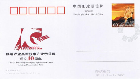 【藏品名称】:JP143《杨凌农业高新技术产业示范区成立10周年》纪念邮资明信片