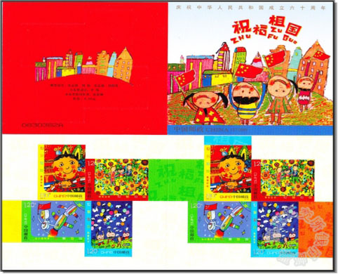 新中国的国庆专题邮票始于1950年的纪4《开国纪念》,以后在国庆的一、十、十五、二十五、三十、三十五、四十、五十、五十五以及六十周年分别发行纪念邮票,共约21套,其中纪106M《国庆小全张》以连票内容且票面相连处不打孔的形式出现,如今价格已高达数万元,《祝福祖国本票》尽管是6月1日发行的儿童画邮票,但小本票的封面印为“庆祝中华人民共和国成立六十周年”纪念邮票主题,红色国庆主题邮票使得《祝福祖国本票》更具双重收藏意义。