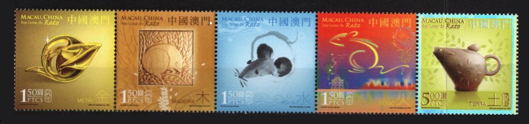 【正面图案】:金鼠(1.50澳门元)、木鼠(1.50澳门元)、水鼠(1.50澳门元)、火鼠(1.50澳门元)、土鼠(5.00澳门元)