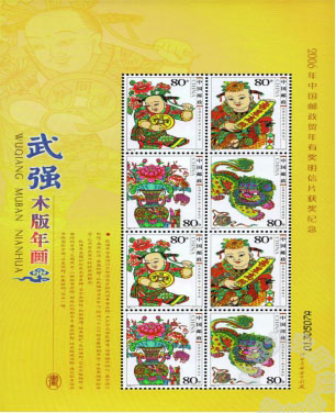 武强年画小版是年画系列小版中唯一的“黄袍加身”。整版邮票散发出的皇家富贵让人过目难忘。武强年画小版采用雕刻版印制,是中国邮政和中国印钞造币公司紧密合作推出的艺术精品,在纸张的选择上比一般邮票厚很多,拿在手上感觉不到一般小版邮票的绵软,而是有着纸币的那种硬挺和质感,黄色边纸的设计更是使这版邮票如虎添翼,充满皇家风范。可以毫不夸张地说这是一版跟纸币最接近的邮票品种,它的防伪性能非常突出。