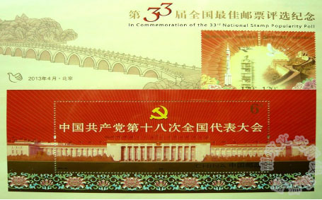 随着一个个奖项的揭晓,备受广大集邮爱好者关注的第33届全国最佳邮票评选活动达到了高潮。经过评选,由许开强、饶鉴设计的《中国共产党第十八次全国代表大会》邮票和由郝旭东设计的该套邮票的小型张获最佳邮票奖。