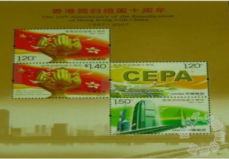 第二枚“合作”,画面采用“CEPA"(《内地与香港关于建立更紧密经贸关系的安排》 )字样和皇岗口岸等作为设计先素,突出两地更紧密地台作与交流。