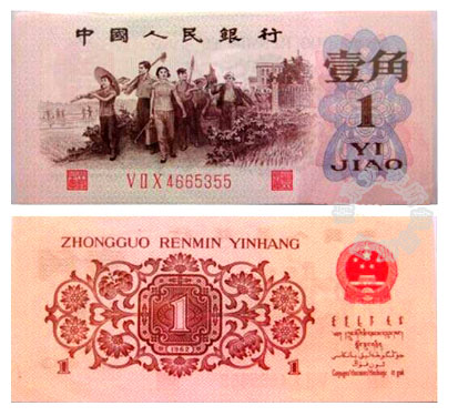 第三套人民币是中国人民银行于1962年4月15日开始发行的。与第二套人民币比价相等,并在市场上与之混合流通。这套人民币与第二套人民币相比,取消了3元纸币,增加了1角、2角、5角和1元四种金属币。纸币中“中国人民银行”六字是由马文蔚先生所书写。票面上方两印章分别为“行长之章”和“副行长章”。纸币背面印有用汉语拼音、蒙古文、维吾尔文、藏文、壮文书写的“中国人民银行”字样。第三套人民币1962年4月20日发行枣红色1角纸币起,到2000年7月1日停止流通,前后历时38年。