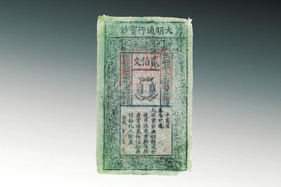 长27厘米,宽16.5厘米。宝钞采用桑皮纤维做钞料,钞纸纤维细长,深蓝灰色。宝钞正面有龙纹边框,边框上的横额为“大明通行宝钞”六字。边框内上层两侧分别为叠文篆书“大明宝钞”和“天下通行”共八字。中间横书钞文“贰佰文”。钞额下面绘钱串图,一串象征一百文。边框内下层楷书“中书省奉准印造大明宝钞,与铜钱通行使用。伪造者斩,告捕者赏银贰佰五拾两,仍给犯人财产。洪武 年 月 日”。文字上盖篆书“宝钞提举司印”朱文印一方。背面上层加盖篆书“印造宝钞局”朱文印,背面下层有龙纹边框,框内横书钞额和钱串图。史载,明洪武八年(1375年)“诏中书省造大明宝钞”,洪武十三年(1380年)废中书省,印钞改属户部。中书省发行宝钞仅5年,传世稀少。