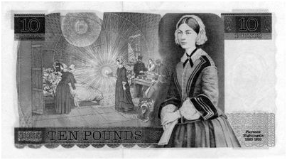 英国人把南丁格尔的肖像安放在旧版10元英镑背面,这位女性平静的脸上散发着一种神性的光辉。