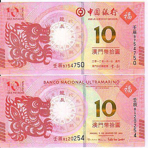2012年1月12日,澳门特别行政区推出面值为澳门币壹拾圆的壬辰龙年贺岁钞,由中国银行及大西洋银行分别发行流通。