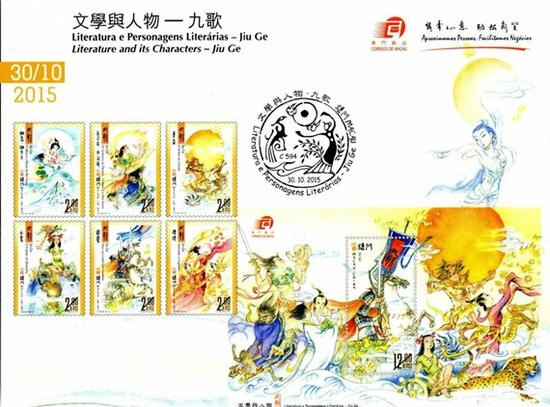 澳门邮政局将于星期五30日发行以古代诗人屈原作品《九歌》为主题的新邮品 中新网10月29日电 据澳门电台报道,澳门邮政局将于星期五(30日)发行以古代诗人屈原作品《九歌》为主题的新邮品。 据报道,邮品以《九歌》当中的人物为题材,将推出6款邮票以及1款小型张,各发行 50万枚,另外亦有首日封和极限明信片等邮品。 报道说,《九歌》邮品是今年澳门邮政局发行的第13套主题邮品,今年稍后还有另外3套邮品发行,多过平常的每年12至14套。