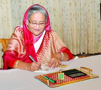 本报讯 为纪念中国与孟加拉国建交40周年,孟加拉国发行纪念邮票1套1枚。10月17日,孟加拉国总理哈西娜在总理府主持了孟中建交40周年主题纪念邮票及首日封发行仪式,并为邮票首日封签名(图1)。孟加拉国外交部长阿里、孟外交部国务部长阿拉姆、孟邮电部国务部长阿利姆、中国驻孟加拉国大使马明强等应邀出席。