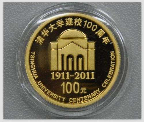 清华大学,因坐落于北京西北郊的清华园而得名。初称“清华学堂”,是清政府设立的留美预备学校,翌年更名为“清华学校”。1925年设立大学部,1928年更名为“国立清华大学”。清华大学是中国乃至亚洲最著名的高等学府之一,王国维、梁启超、陈寅恪、赵元任等一大批学术巨匠曾在此执教。2011年清华大学迎来百年华诞,为纪念这一历史时刻,中国人民银行于同年7月29日发行了清华大学建校100周年金银纪念币一套。其中,1/4盎司金币和1盎司银币的正面图案均为中华人民共和国国徽,并刊国名、年号。这个图案和我国最早的分钱硬币图案非常接近,代表了清华大学历史源远流长。