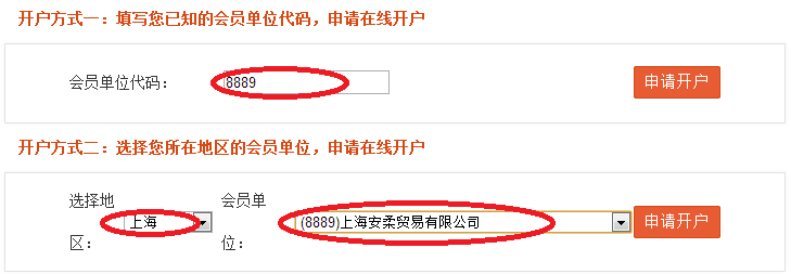 2、填写会员单位号段“8889”或者选择“上海”以及“(8889)上海安柔贸易有限公司”,点击右侧“申请开户”。