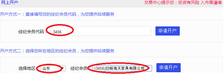2、填写会员单位号段“3456”,“或选择地区:山东,会员单位:(3456)日照海沃家具有限公司,”点击右侧“申请开户”。