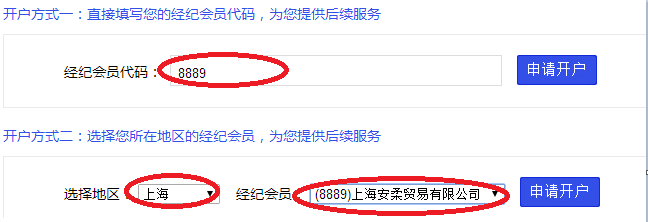 2、填写会员单位号段“8889”或者选择“上海”以及“(8889)上海安柔贸易有限公司”,点击右侧“申请开户”。