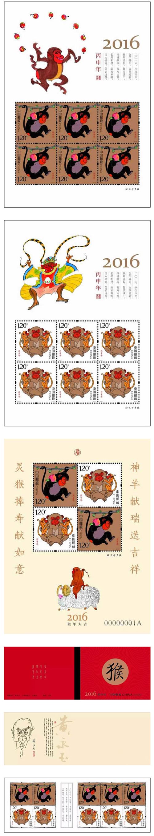 中国邮政定于2016年1月5日发行《丙申年》特种邮票1套2枚,小本票1本。详情如下: