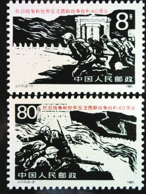 第一枚邮票为“八路军和民兵战斗在长城内外”,是1985年9月3日发行的《抗日战争和世界反法西斯战争胜利四十周年》纪念邮票的第二枚,长40毫米,宽 27毫米,面值80分。邮票主图以长城为背景,展现了民兵武装配合八路军痛击日寇的场景。图中的八路军战士,正持一挺从日军手中缴获的大正十一式轻机枪, 沉着冷静地射击。该枪因其在日本大正天皇十一年(1922年)定为制式机枪而得名,其枪托为便于贴腮瞄准向右弯曲,所以又被称为“歪把子”轻机枪。“歪把 子”口径6.5毫米,弹容30发,采用左侧弹斗供弹。其后坐力小,连发时能保持较好的射击精度。“歪把子”的致命缺点是不能更换枪管,连续射击200发左 右,枪管必须冷却5分钟以上,否则有炸膛危险。我军常利用“歪把子”的熄火间隙,集中火力打掉日军射手,从而缴获武器。