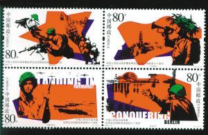 第二枚邮票为 “七·七战火”,是1995年9月3日发行的《抗日战争暨世界反法西斯战争胜利五十周年》纪念邮票的首枚,长40毫米,宽30毫米,面值10分,定格了中国守军第29军在卢沟桥头严密布防、抗击侵略的历史场景。邮票上威严镇定的指挥员身边,几挺捷克ZB-26式轻机枪严阵以待,即将发出全民族抗战的怒吼。 这款机枪于1926年在捷克斯洛伐克布尔诺国营兵工厂(英文简写ZB)批量生产,次年我国开始进口和仿制。全面抗战爆发前,该枪在我国已超过12万挺,抗 战期间又仿制了近4万挺。它口径7.92毫米,用20发弹容弹匣供弹,结构简单,性能稳定,可单发、点射、连发,射击精度极高,有效射程在900米内。值 得称道的是它的二三发点射,日寇被瞄准开火后往往都是身中数弹,当场毙命。该机枪更换枪管只需四五秒钟,是压制“歪把子”轻机枪的利器;其弹道极为稳定, 易于训练掌握,被誉为中国步兵抗战的“完美武器”。只可惜数量太少,抗战中我军火力绝大多数情况仍处于劣势。
