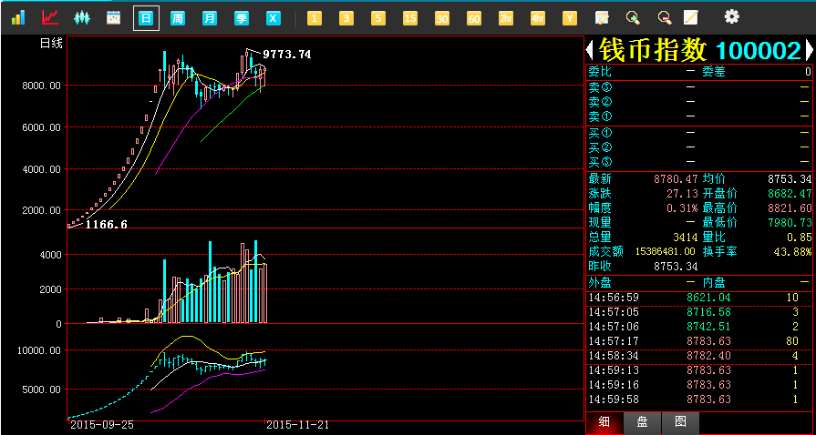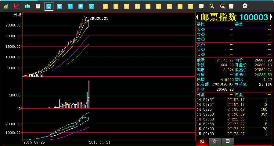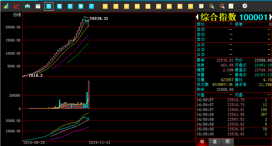 2015年11月21日,青西文交所综合指数报收于22530.82点,较昨日上涨461.86点,最低22061.16点,最高22748.36点,涨幅2.09%;成交423057手,成交金额8319万元。今第二批托管藏品陆续开板,市场延续火爆局面,成交量成交额创历史新高。
