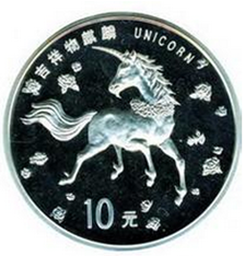 中国人民银行在1994年开始发行“麒麟”金银纪念币。94年“送子麒麟”, 95年 “跃立麒麟”, 96年 “行走麒麟”, 97年的 “母子麒麟”,它们正面是中国麒麟,而背面都是似马非马,似犀非犀的“西方麒麟”——独角兽。可见无论在东方还是西方,麒麟都是祥瑞,都能找到参照物。所以这些“麒麟”钱币上均铸有“吉祥物麒麟”,正面的“中国麒麟”有祥云缭绕,背面的“西方麒麟”则是鲜花环绕,不仅象征中外友好,而这枚钱币铸造精细,麒麟身上鳞片历历可数也是其艺术魅力之所在。