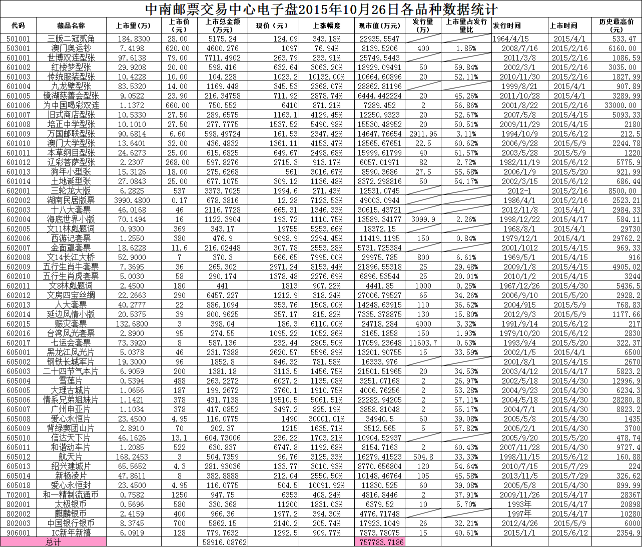 >> 中南邮票交易中心电子盘2015年10月26日各品种数据统计