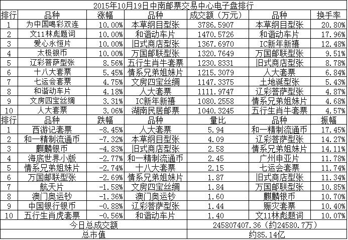 中南邮票交易中心电子盘2015年10月19日排行